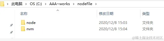 ①.在指定的文件下新建两个文件夹,一个用来存放nvm的安装文件,另一个用来存放node的文件