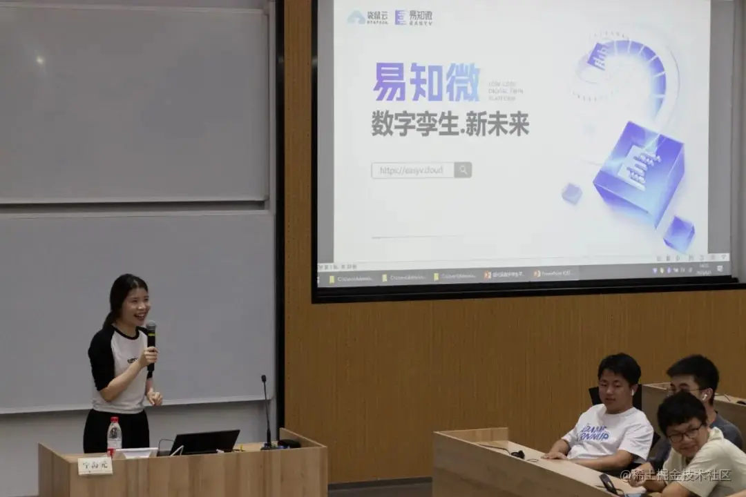 在听完易知微低代码数字孪生平台及其应用介绍后,学生们深刻认识到数字孪生技术在现代工业领域中的重要性和应用前景,对数字孪生职业发展方向产生了极大兴趣。在企业和岗位介绍环节中,易知微人力资源经理详细介绍了企业的发展历程和产品特点并和大家分享了易知微独特的企业文化和实习生成长平台——袋鼠青年计划,让实习学生更深入地了解易知微企业实力,在互动环节中,学生们针对实习岗位和未来发展方向等问题提出了问题,人力经理都进行了现场解答。