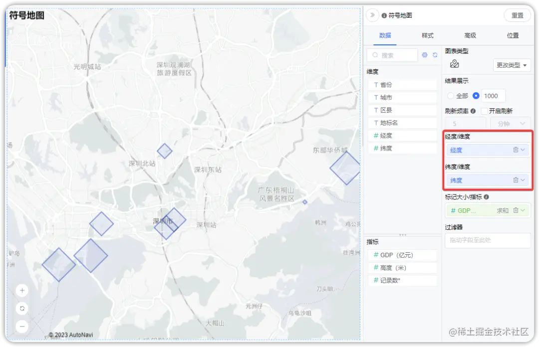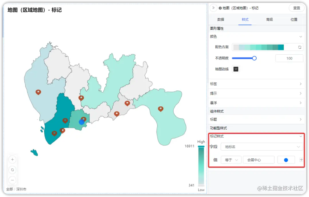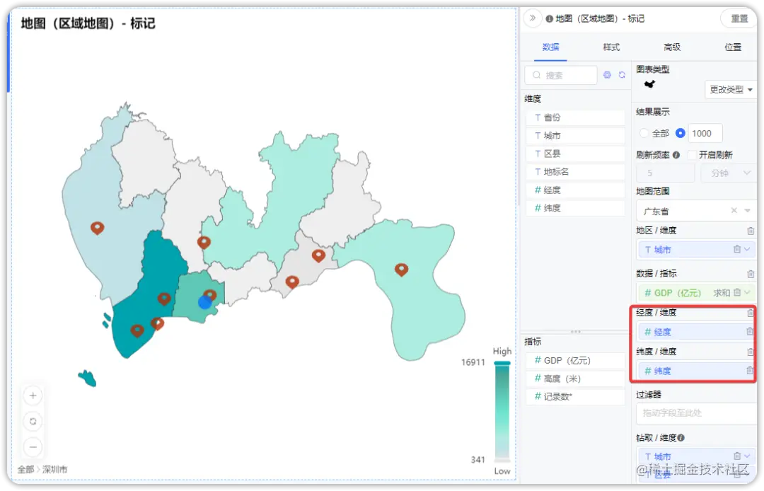 地图(区域地图)还支持经纬度数据,可以将经度和维度字段拉入维度框进行地理标记,也可以在已有地区维度数据的基数上增加经纬度数据,既能反映出数据的分布情况又具备标识的功能。此外,在数据设计为经纬度字段时,在样式设计中还支持对特定的值进行标记设置。