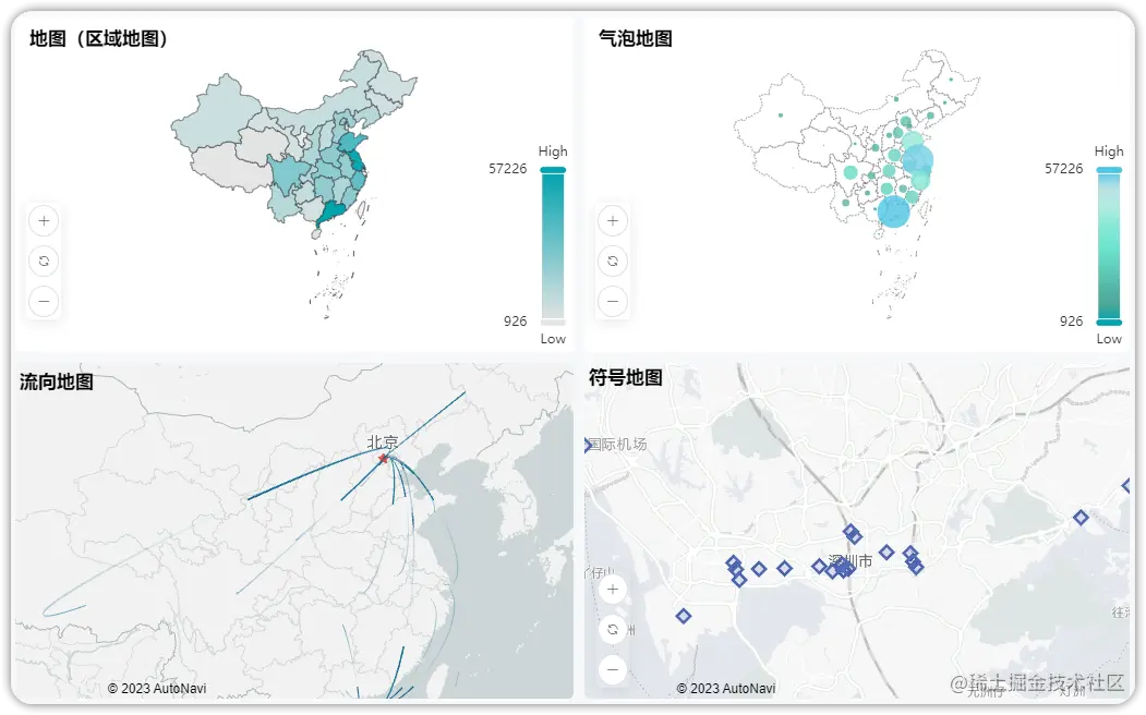 DataEase提供了四种类型的地图视图,具体为:地图(区域地图)、气泡地图、流向地图和符号地图。 接下来,我们就为大家详细介绍这四种地图视图及其使用场景。