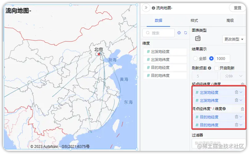 需要注意的是,流向地图的数据集中起点经纬度和终点经纬度各自是两个字段。
