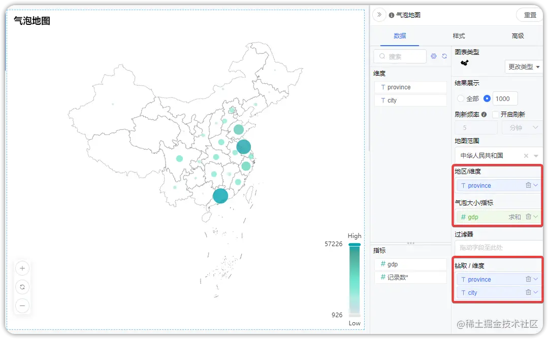 在DataEase仪表板编辑页面点击“视图”选项,选择数据集后,在“ECharts”图库菜单中图表类型选择“气泡地图”选项,数据设计中地区范围选择“中华人民共和国”(如需按照城市展示,可选择对应的省份地图),将“pronvince”(省份)和“gdp”字段分别拖到维度框(地区)与指标框(气泡大小)。如果需要实现区域下钻,同样需要将对应的层级区域放到钻取框里。