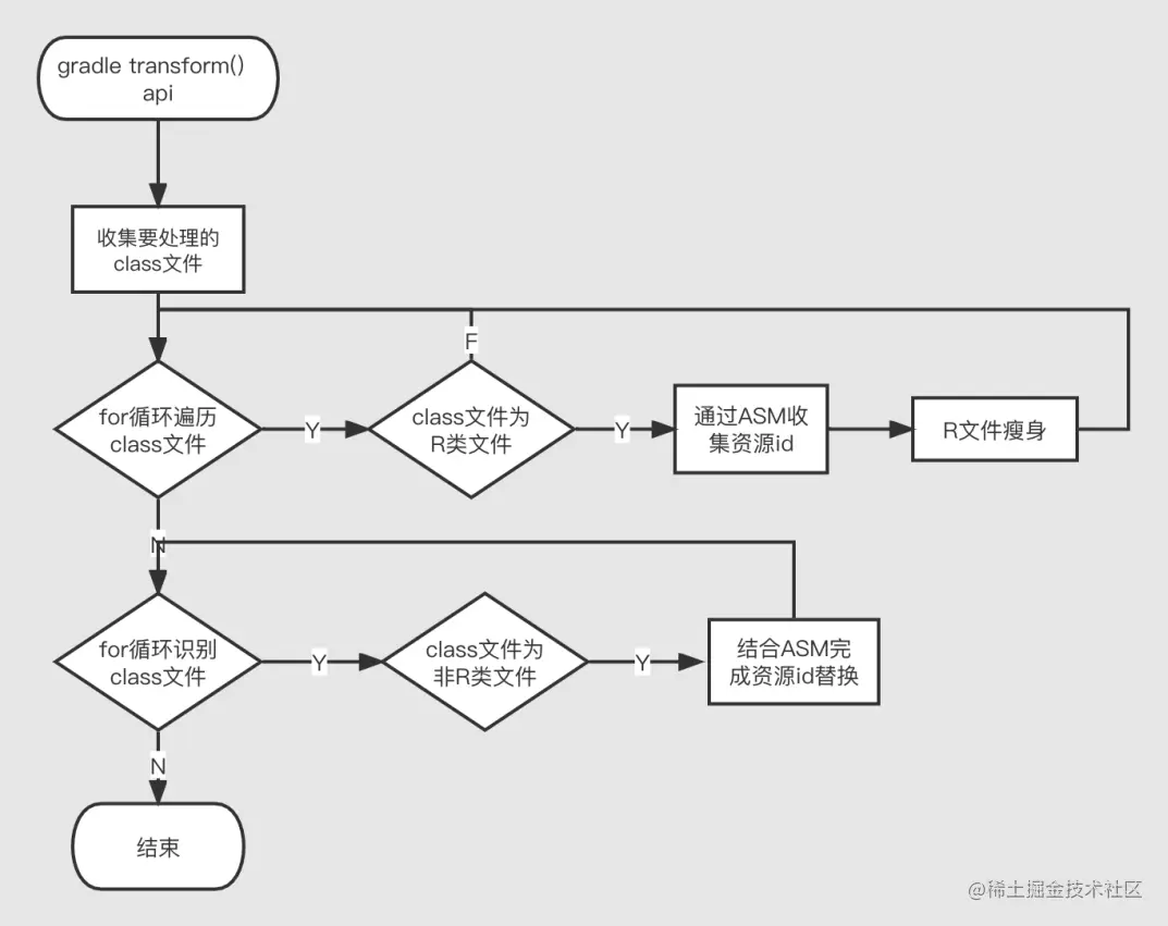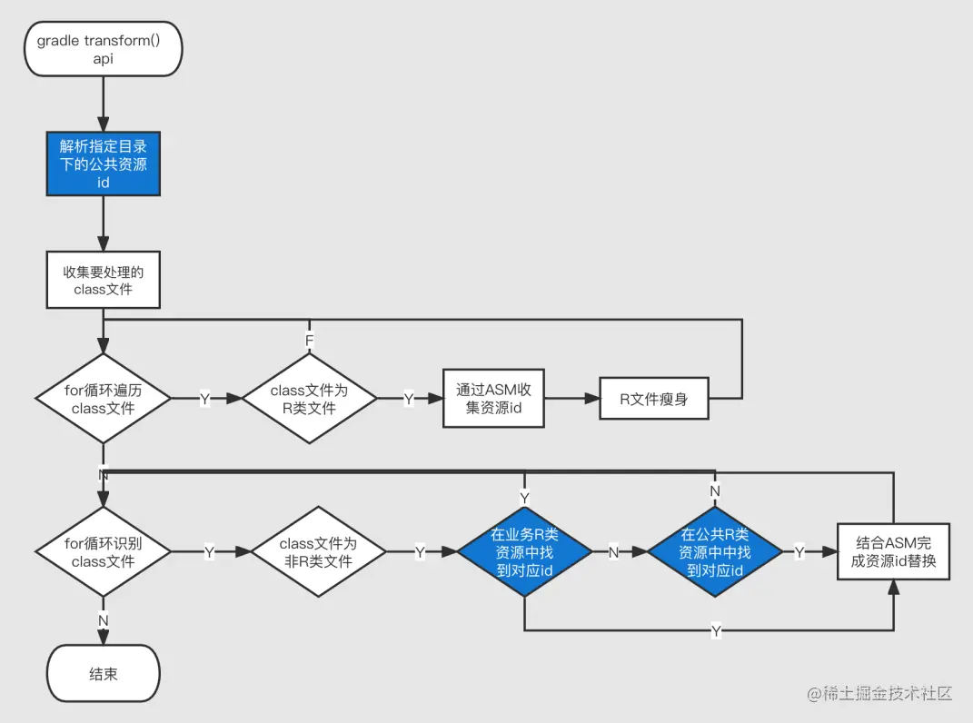 修改R文件瘦身gradle plugin 代码,从指定位置读取并识别这部分公共资源,按照<name,id>的形式进行变量存储,并在后续过程中对业务模块中的公共资源部分进行id替换。
