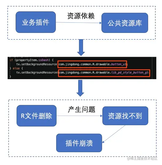 公共库跟随宿主一起打包,在宿主打包过程中引入R类瘦身插件,打包后的apk有明显的减小,手机安装apk后启动首页正常展示无问题,但在打开某些业务插件时,会有异常闪退现象,崩溃类型为R.x resource not found。对崩溃原因分析如下:业务插件代码中使用了公共库中的R类资源、插件打包流程独立于宿主打包,在插件打包的过程中仅完成了业务模块R类的内联,并没有考虑到公共资源R类的内联,基于上述原因当宿主打包过程完成R类文件删除瘦身后,我们在运行某业务插件的过程中,自然就会报公共资源R类找不到的问题从而产生崩溃。