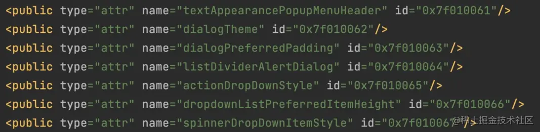 利用appt2的-stable-ids和-emit-ids两个参数实现固化资源id的功能,并将将固化后的ids文件命名为shared_res_public.xml存储在公共资源库中,业务插件依赖公共资源库,在打包编译的过程中aura会将shared_res_public.xml复制到业务工程临时编译文件夹intermediates下的指定位置并参与业务模块的打包过程中,其文件内容格式如下: