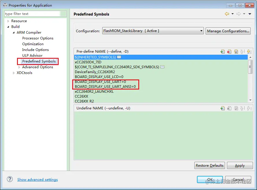 默认 BOARD_DISPLAY_USE_UART 和 BOARD_DISPLAY_USE_UART_ANSI 两个宏是为1的,本来TI工程的串口使用,现在要把这两个宏修改为0。