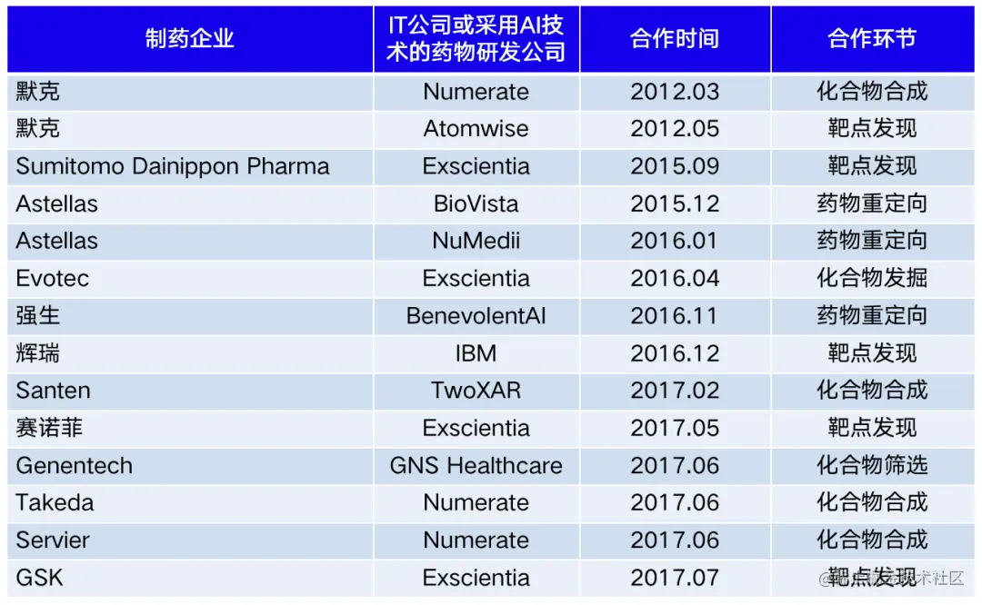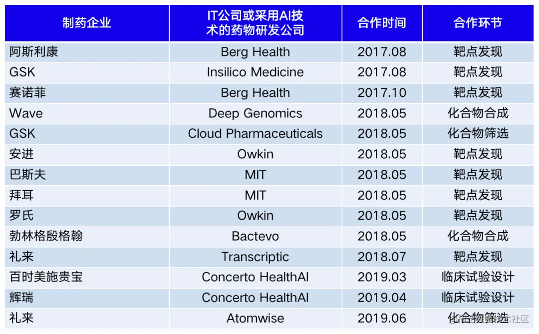 目前在制药领域,AI 制药主要由三大类公司进行相互协作共同推进药品研发进程,IT 技术公司、药物研发 CRO 公司以及大型药企。IT 公司利用自身的互联网基础与平台优势赋能行业应用,大型药企则拥有药物研发的相关数据、成熟的研发管线以及资深的药物专家,在优势互补的情况下,目前已经可以看到AI制药的很多成熟案例。