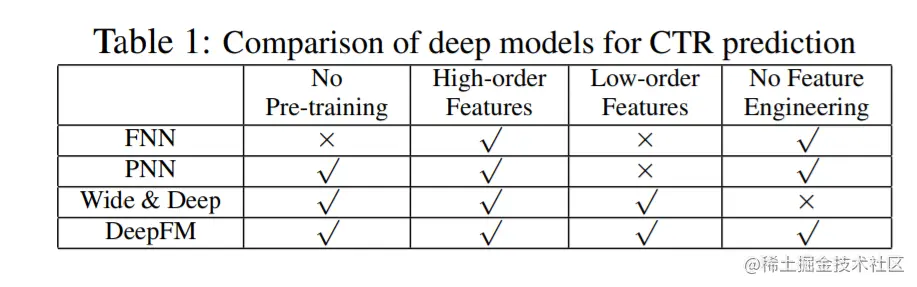 如表1所示,关于是否需要预训练,高阶特征,低阶特征和是否需要特征工程的比较上,列出了DeepFM和其他几种模型的对比。DeepFM表现更优。