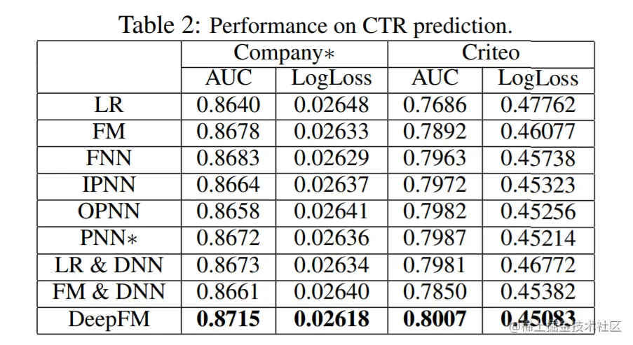 如表2所示,不同模型在Company*数据集和Criteo数据集上对点击率CTR进行预估的性能表现。DeepFM在各个指标上表现均强于其他模型。