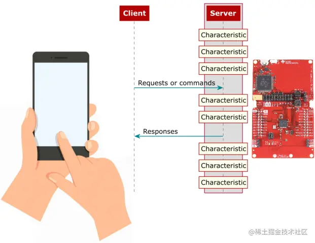 外围设备(从机)作为 GATT 服务端(Server),它维持了 ATT 的查找表以及 service 和 characteristic 的定义;