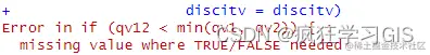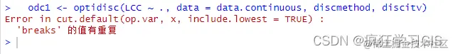 同时,也发现有些离散化方法在执行过程中,会出现某种类型的报错。如下图所示,我在运行地理探测器时出现报错,随后不断调整discmethod参数;经过不断尝试,发现只要将自然间断点法"natural"这个选项去掉,那么就可以正常运行了。