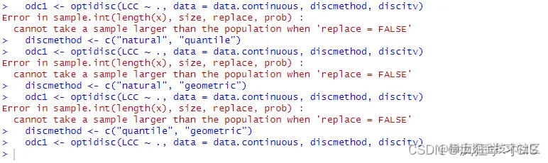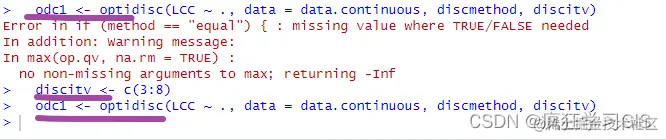 其次,同时发现有的时候将连续变量离散化参数中的discitv,也就是类别的数量适当调小,也会解决一些报错。如下图所示,原本我的discitv参数设置的是c(7:8),而后运行代码出现红色的报错提示;随后尝试将discitv参数设置为c(3:8),就可以正常运行不报错了。