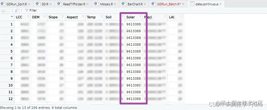 首先,针对出现红色字体的报错问题,发现只要数据量足够大,几乎可以解决一切问题。在一开始第一次用GD包进行地理探测器分析时,我当时的分析数据共有十几列,行数高达几十万行;而后来开始遇到这些报错问题的时候,我的分析数据列数没有变,但是样本数量变少了,大概只有几千行,少数甚至只有几百行。这个是行数,也就是样本数量;而对于列数同样是如此——在网上看到有用户增添了分析数据的变量数(列数)后,同样可以消除报错情况。因此,看来在数据量足够大时,很多报错信息都不会出现;而在数据量比较小的时候,才有可能出现各类报错问题。因此,如果条件允许,建议大家先提升数据量试一下。