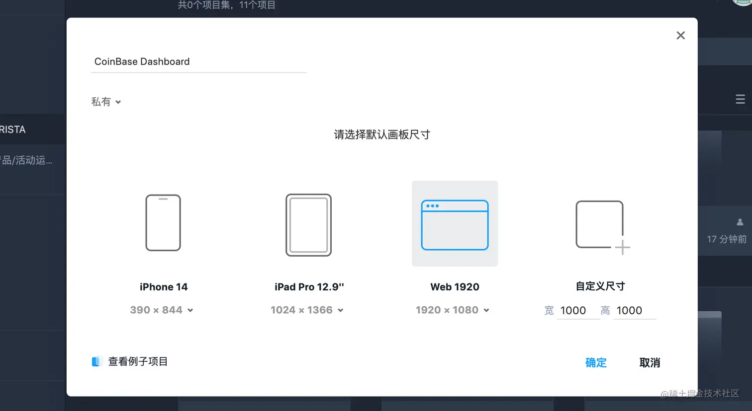 根据产品的类型,选择相对应的原型项目和项目尺寸,常见的原型项目类型包含手机、平板电脑、网页以及自定义尺寸。这里我们以CoinBase网页端后台作为例子进行原型设计,创建原型项目比较简单,只需填写项目名称,选择尺寸即可。