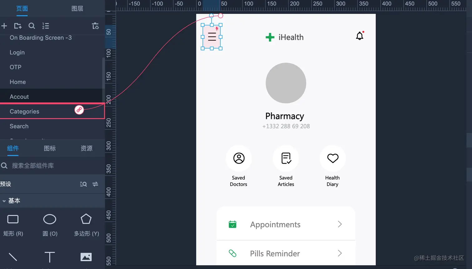 通常,我们采用拖拽矩形组件、按钮组件、文本组件等预设组件的方式快速完成页面搭建,如果是手机项目也也可以使用iOS组件库以及Antdesign组件库等。