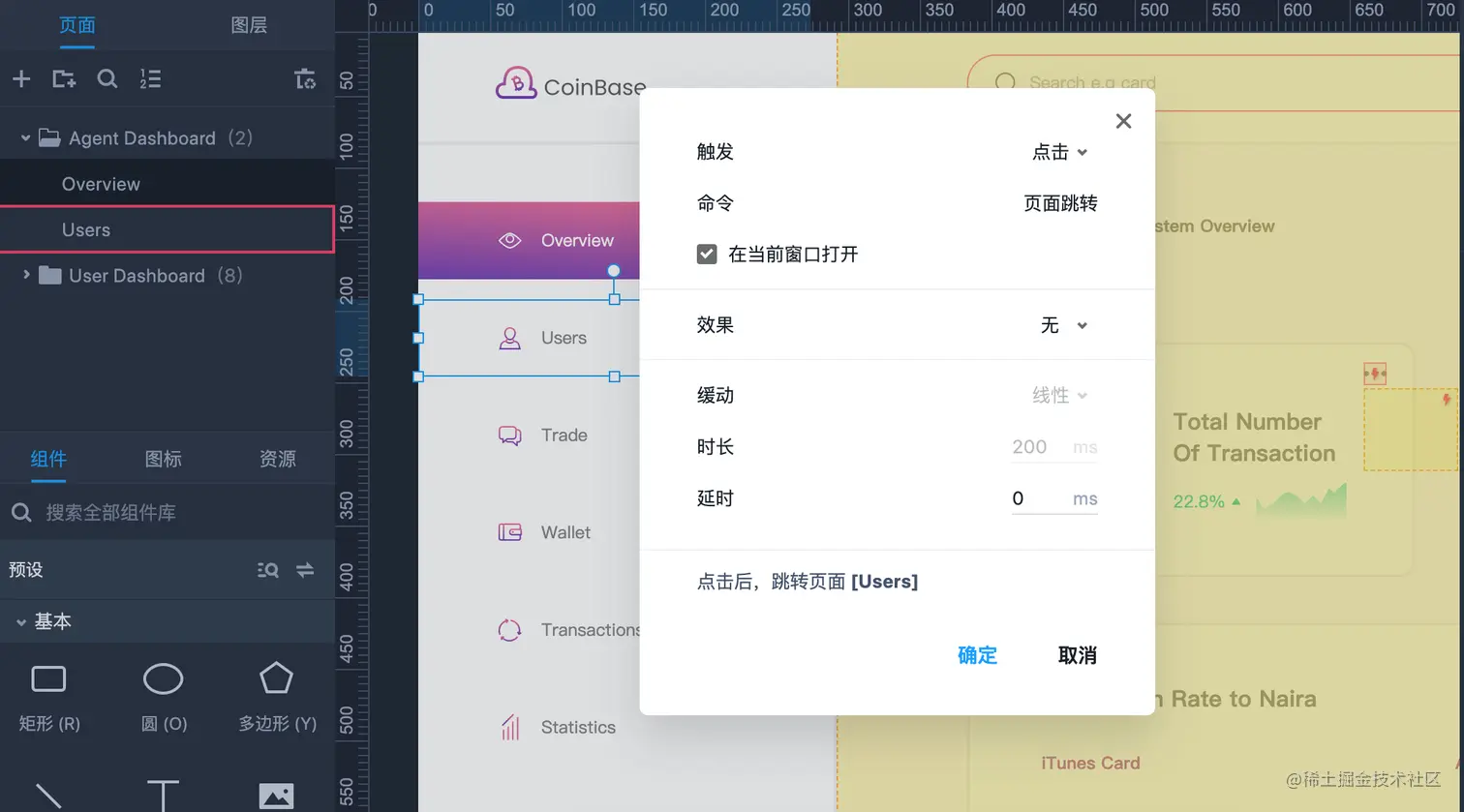 这里我们给主导航【用户】添加了页面跳转的交互效果,只需要拖拽组件的链接点点对应的目标页面,然后设置触发方式为点击,命令为页面跳转即可。