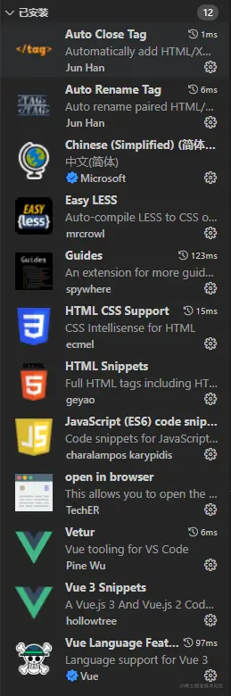 vscode 常用插件 努力生长 2023-06-13 178 阅读1分钟 Auto Close Tag Auto Rename Tag Chinese Easy LESS Guides HTML CSS Support HTML Snippets JavaScript (ES6) code open in browser Vetur Vue 3 Snippets Vue Language