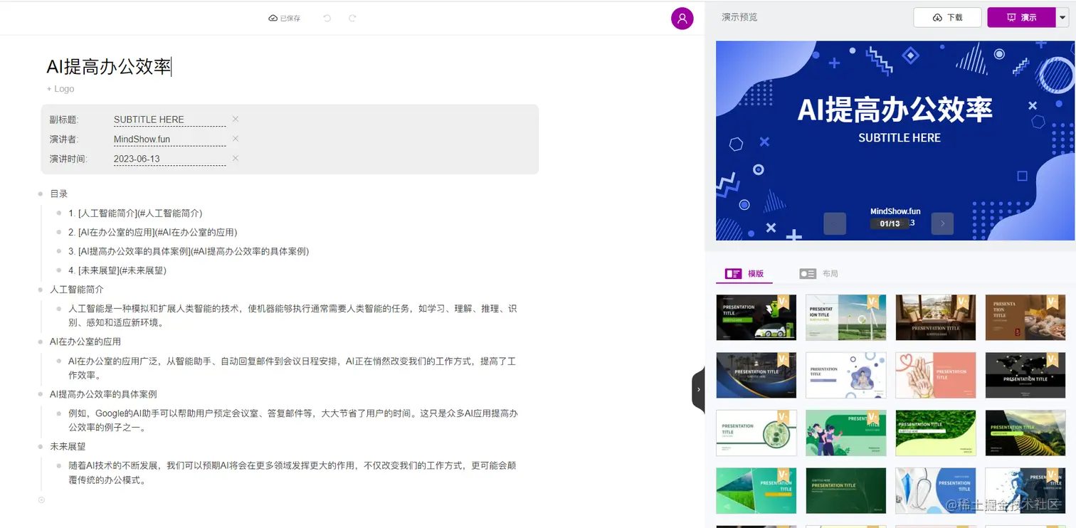 总的来说,ChatGPT作为一款人工智能工具,其生成PPT的能力不仅可以提高工作效率,同时还能发挥出人工智能在语言处理上的优势,这为用户提供了一个全新的、高效的PPT制作方法。