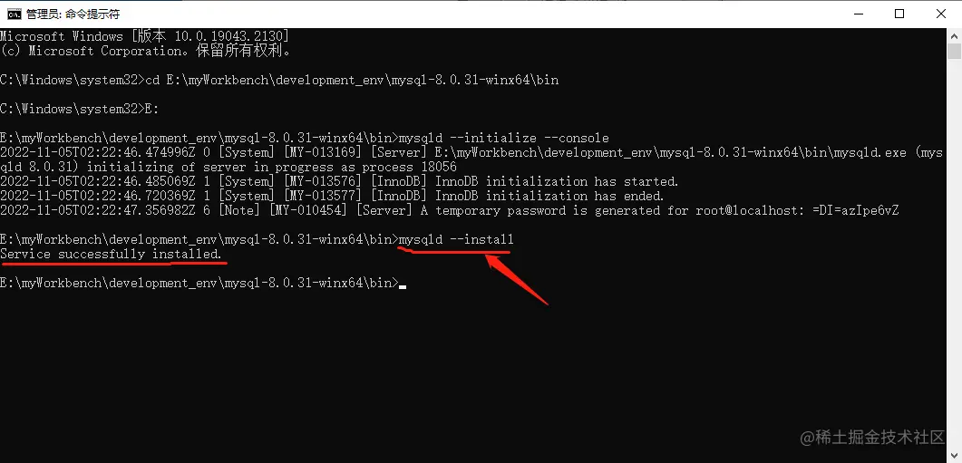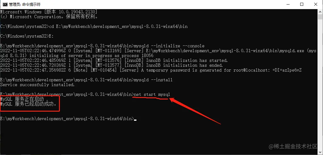 注意![注意] [MY-010454] [服务器]为root @ localhost生成临时密码:9P0gYk-?0,kT 其中root @ localhost:后面的9P0gYk-?0,kT就是初始密码(不含首位空格)。 在没有更改密码前,需要记住这个密码,后续登录需要用到。复制密码先保存起来!!!