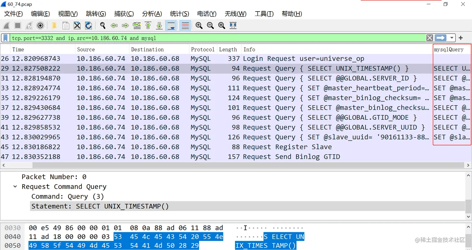 以下显示过滤器表达式中的内容表示:将包中 TCP 端口为 3332,源端 IP 地址为 10.186.60.74,协议类型为 MySQL 的内容过滤并展示,效果如图: