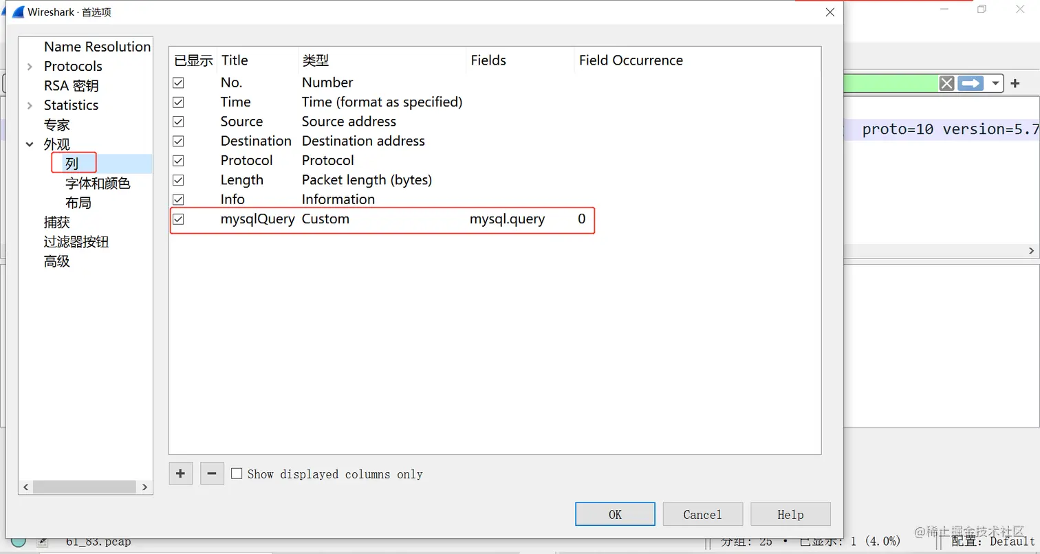 同样地,也可以在 Wireshark 中将 mysql.query 字段展示出来:Wireshark -> 编辑 -> 首选项 -> 外观 -> 列 。