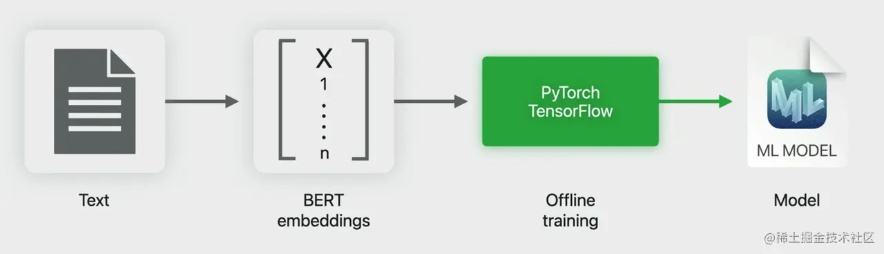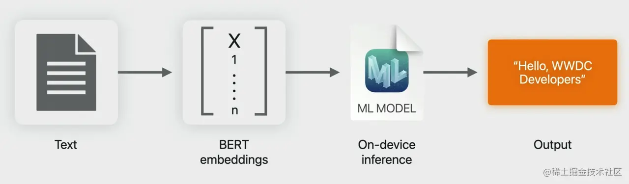 通过 NLContextualEmbedding API,也可以将 BERT 作为 PyTorch 或 TensorFlow 的输入层进行训练,并使用 Core ML 提供的工具将结果转换为 Core ML 模型,然后部署到端上使用。