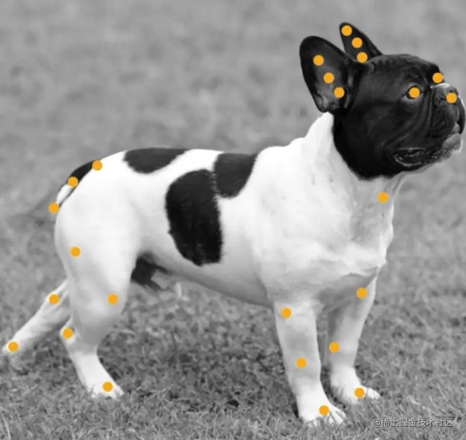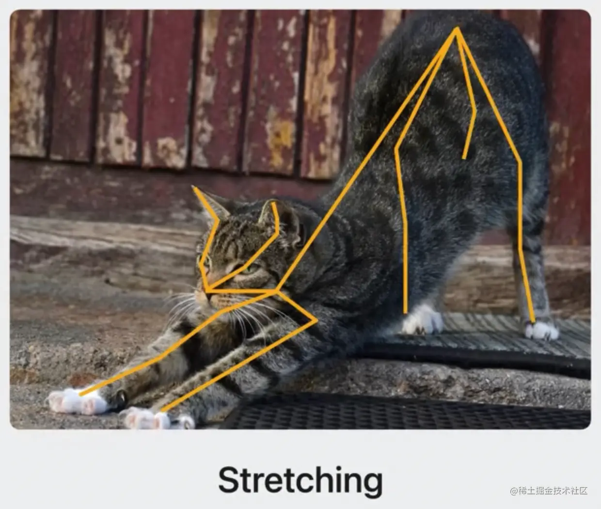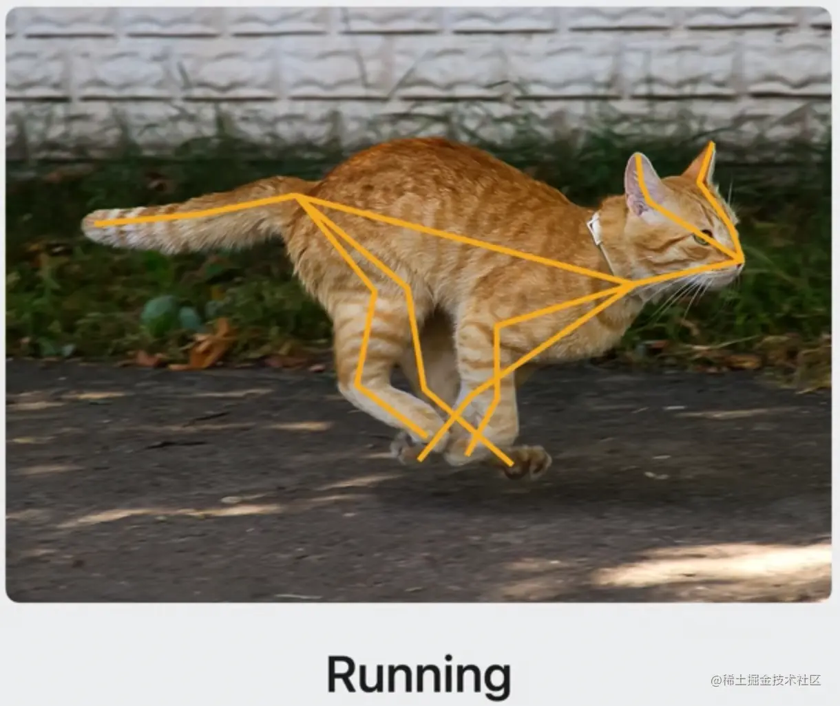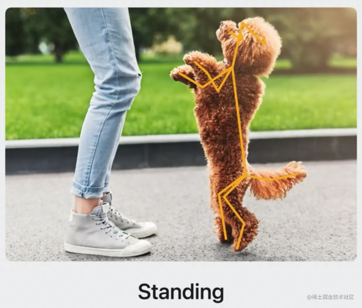 而进一步想了解动物的动作、行为等,该 API 就不能满足了。Animal Body Pose 是 Vision 中的一个新 API,通过 DetectAnimalBodyPoseRequest 返回动物身体关节位置的集合。该 API 支持猫和狗的识别,并返回包括尾巴、耳朵在内的 25 个动物身体关键点标志。