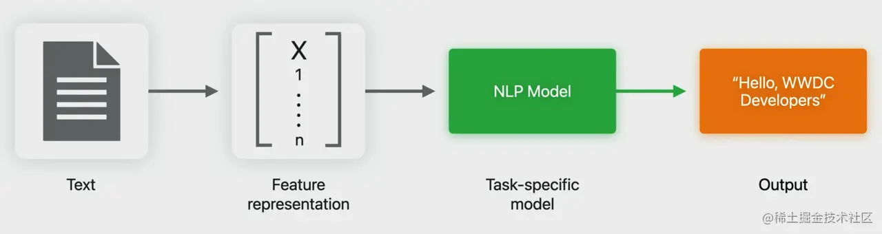 NLP 模型通常具有类似的流程:他们接收文本数据,通过一个输入层将其转换为数值特征表示,然后机器学习模型可以对其进行操作,并产生一些输出。