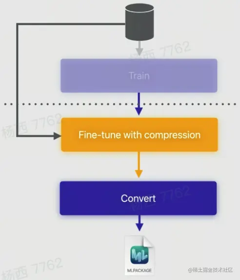 为了克服在高压缩率下模型性能下降的问题,Core ML Tools 7,新增了训练时压缩的功能。使用新的 API,在预训练模型中插入一个压缩层(例如剪枝层),然后使用原来的训练数据和代码对其进行微调(fine-tune)。在对权重进行压缩时,对模型进行微调。压缩是逐渐引入的,并以可微分的方式进行,使权重能够重新调整以适应压缩。