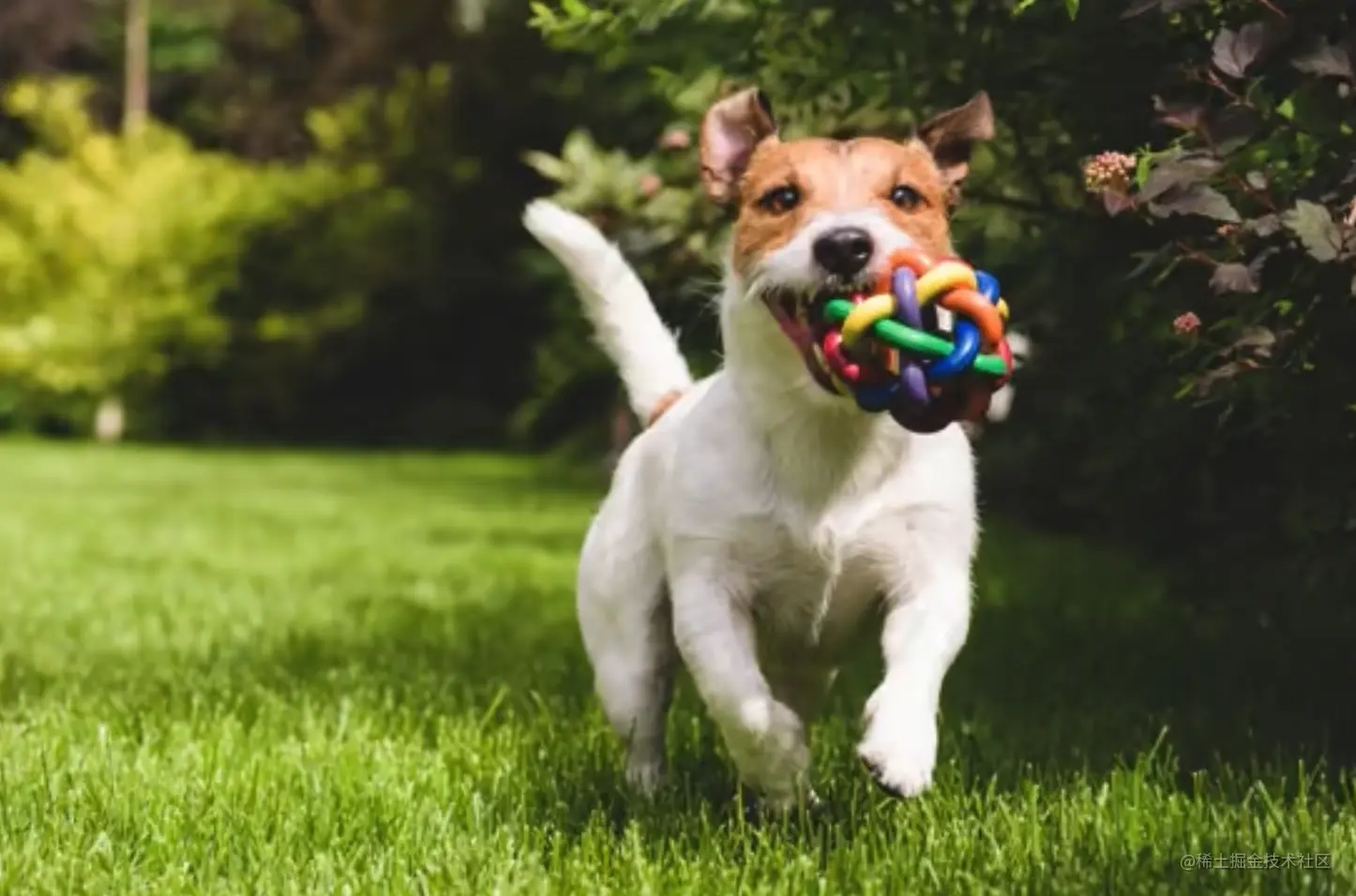而多标签图像分类器可以预测图像的一组对象、属性或标签。例如,下图包含狗、玩具、草地和公园。