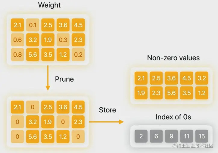 通过剪枝,将权重矩阵中的一些接近 0 的权值设为 0,这样我们就可以只存储非零值以及零的位置。模型的大小与引入的稀疏程度成线性关系下降。