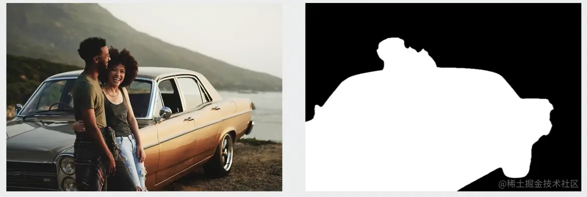 不同于人物提取,前景对象提取的 api 并不专注于提取某一类事物,任何前景对象,都可能被提取。例如下图中,前景提取得到的遮罩,除了人物还包含汽车,他们共同组成了这张图片的前景部分。
