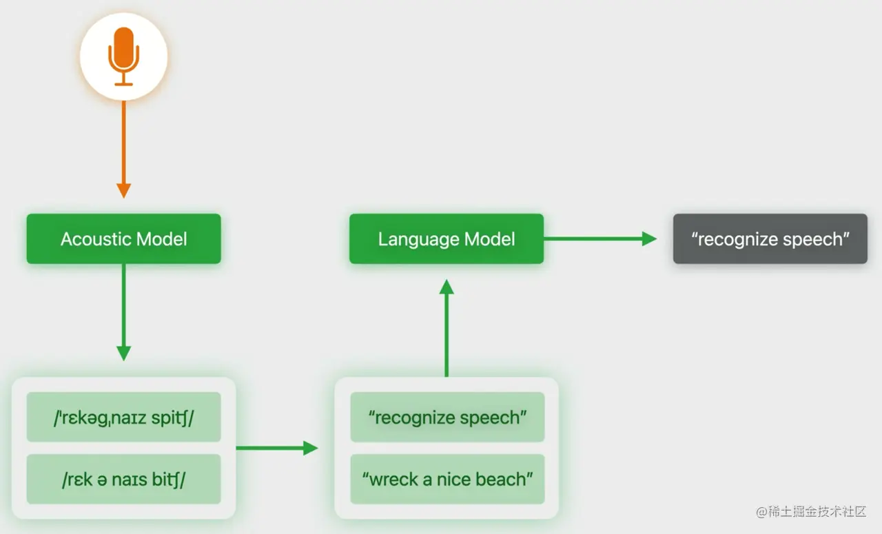 在 iOS 10,我们可以通过 Speech Framework 提供的 API 进行语音识别。语音识别系统先将音频数据输入声学模型(Acoustic Model),生成音素表示,然后将音素表示转换为文本形式或转录。