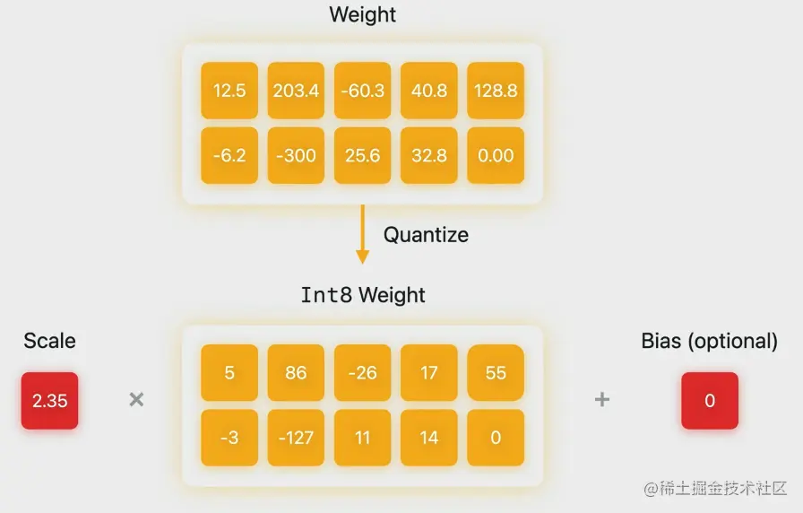 对权重值进行缩放、偏移和舍入,将他们映射入一个更小的数据范围内,例如下图的 Int8 范围内。