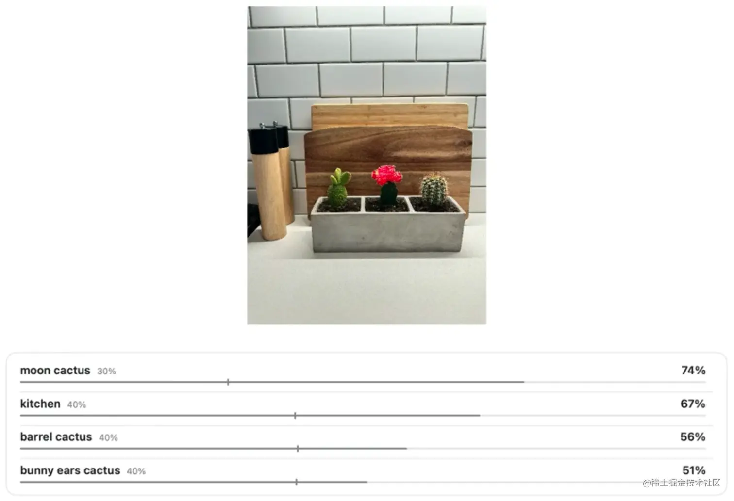 最终训练出的模型,可以同时预测多个标签,如下图中的月亮仙人掌、厨房、桶状仙人掌和兔耳仙人掌: