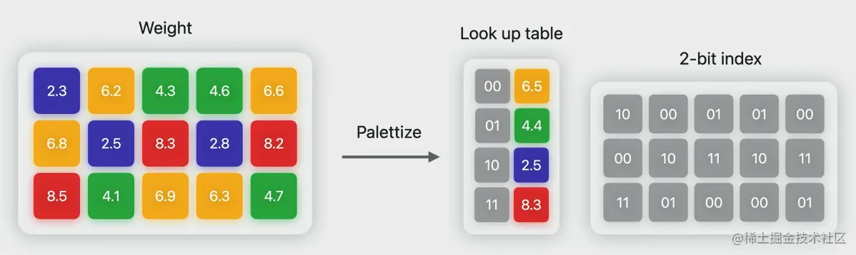 将相近的权重值聚类到一起,并使用它们所属的簇中心值来表示。这些簇中心值存储在查找表中,原始的权重矩阵转换为一个索引表,其中每个元素指向相应的簇中心值。在下图的例子中,能够使用 2 位来表示每个权重,相对于 Float16 实现了 8 倍的压缩。