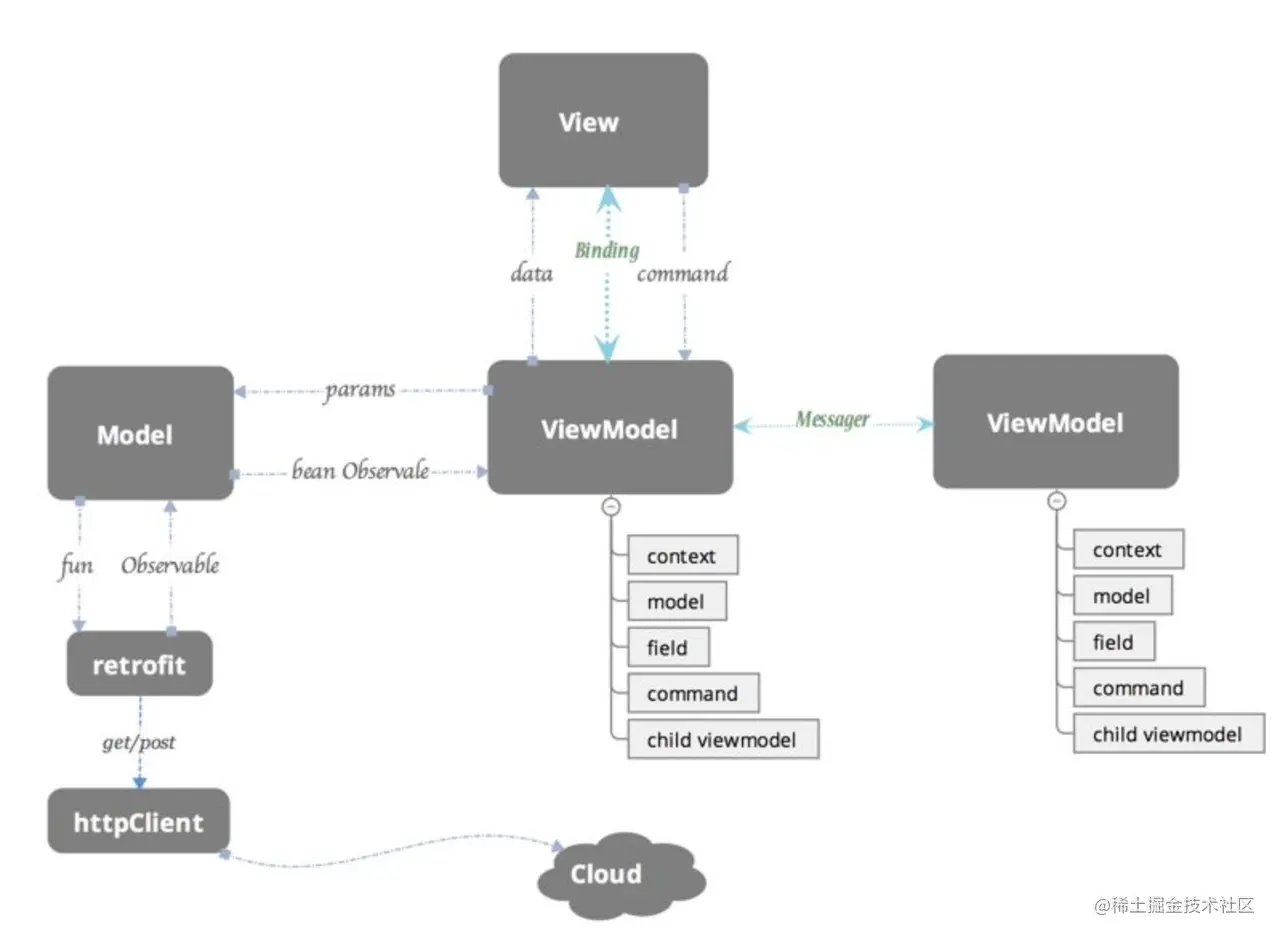 ViewModel(视图模型):类似于呈现器,它从视图中获取用户的输入,并将输入映射到模型上,同时提供用于更新视图的数据和命令。