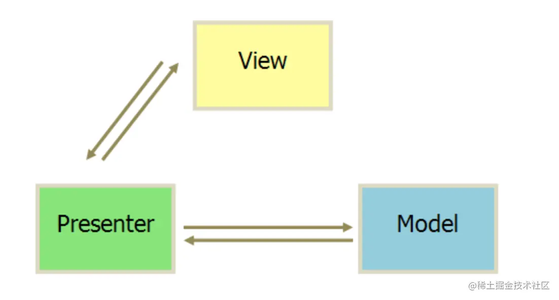 Presenter(呈现器):作为控制器的替代者,从视图中获取用户的输入,并根据输入调用模型更新数据,并将更新的数据传递给视图进行展示。