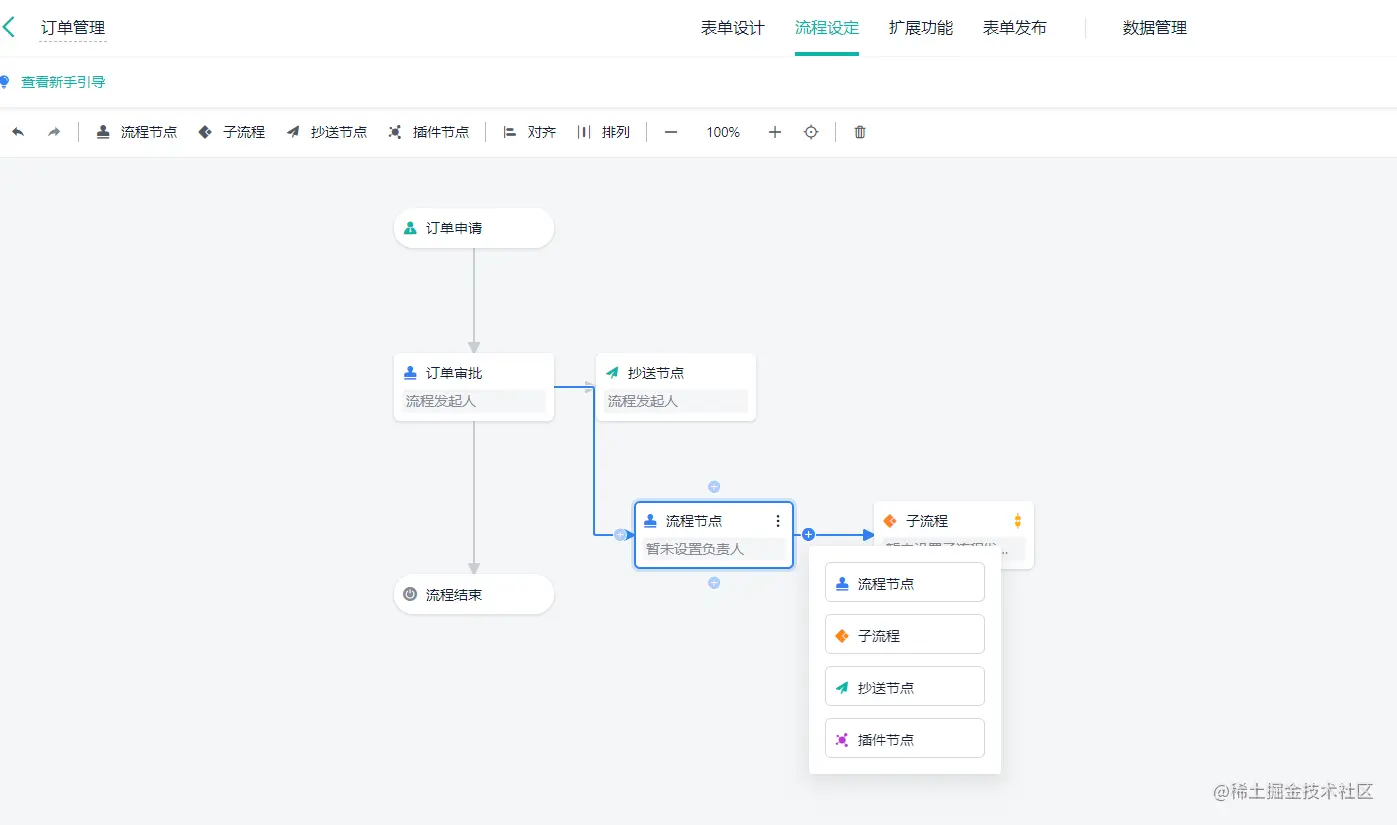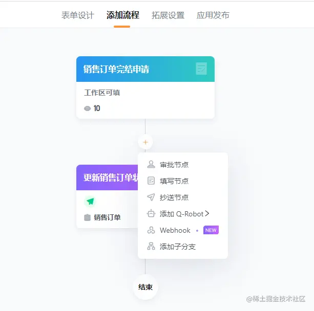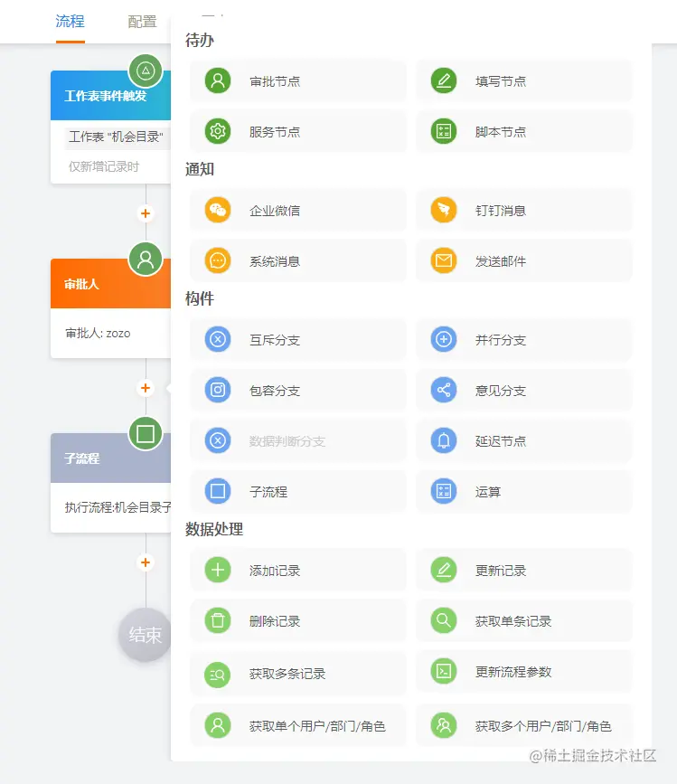 - 流程节点支持审批节点、子流程、抄送、发送消息、添加数据、更新数据等