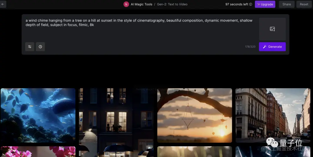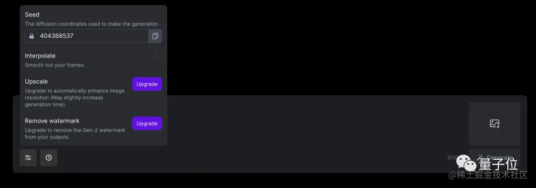 点击右方的“Introducing Gen2”,我们就可以正式开玩了。首先,输入提示词,最多320个字符,然后在左边的设置菜单里进行一些基础配置(包括种子参数、插值等),点击“Generate”。