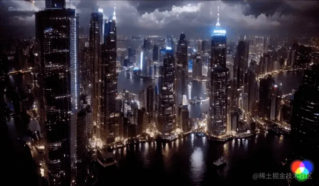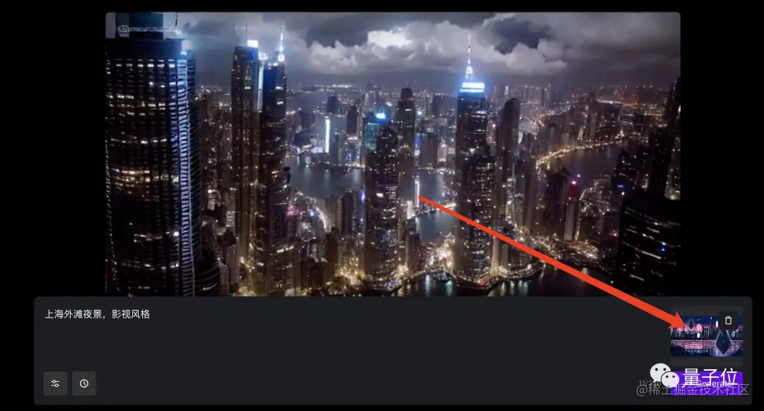 一个航拍视角的视频片段便立即被做了出来。如果想让视频的风格变换一下,也可以上传一张图片,例如我们用的是一张赛博朋克风格的城市照片。