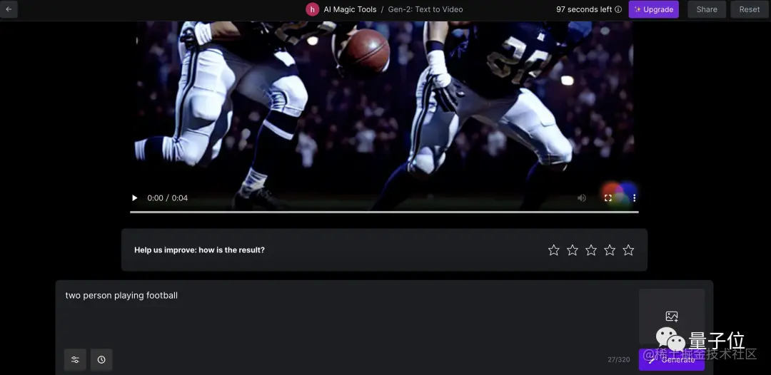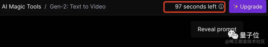 当然,如果你不满意,还能在下方的提示词框中继续修改。需要注意的是,免费试用的额度为105秒(右上角显示剩余额度),每个视频为4秒,也就是大约可免费生成26个Gen2视频。