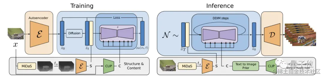 Gen2于今年3月20日正式发布,经历了两个多月的内测,现在终于正式上线。它的前代Gen1只比它早了一个多月(2月发布),所以说迭代速度相当快。作为一个基于扩散的生成模型,Gen1通过在预训练图像模型中引入时间层,并在图像和视频数据上进行联合训练,完成了潜扩散模型到视频生成领域的扩展。其中也包括使用一种全新的引导方法完成了对生成结果时间一致性的精确控制。其架构如图所示: