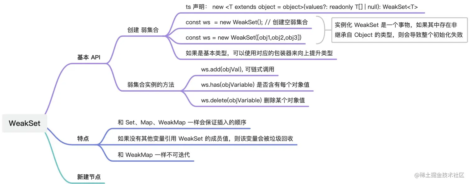 ES6 新增的弱集合(WeakSet),是 Set 的兄弟,API 也是 Set 的子集,描述的是 js 垃圾回收程序对待弱集合中的值的方式 WeakSet 和 WeakMap 都有点相似,比如 WeakMap 的键只能是 Object 或者继承 Object 的类型,尝试使用非对象设置值都会抛出 TypeError