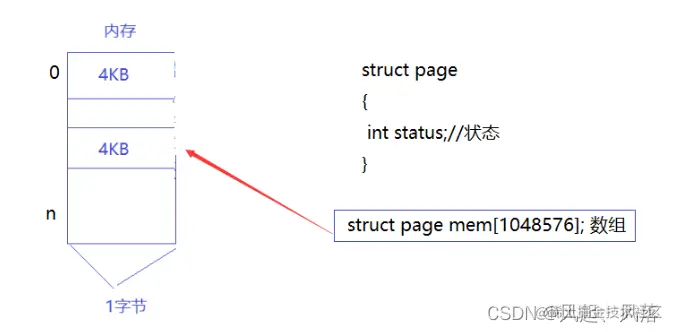 数组有下标存在,物理内存中分别对块进行编号0-n , 若想要在查询物理内存中那些位置被占用,通过找到对应数组下标,即可看到对应的结构体里面对应的状态 若没有分配,则将状态置为1