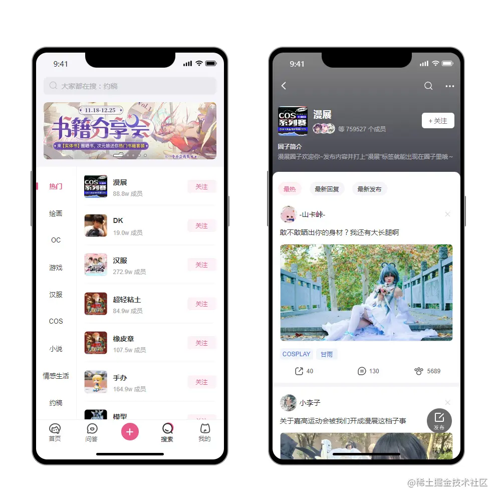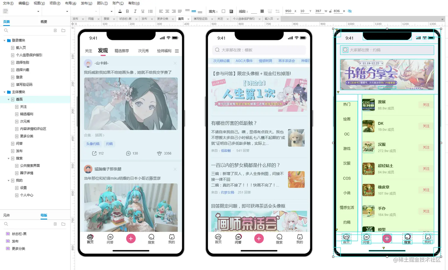 二次元ACG社区动漫社区交友高保真Axure RP交互原型图移动端APP模板, 包括载入页、个人信息保护指引、选择性别、选择兴趣、登录、填写验证码、首页、关注、精选福利、次元秀、内容详情和评论区、更多分类、问答、发布、搜索、公共搜索界面、圈子详情、我的、设置、个人中心。