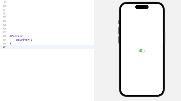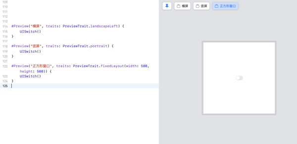 另外 #Preview {} 不仅支持 swiftUI,还支持 UIKit,比如预览一个 UISwitch 开关: