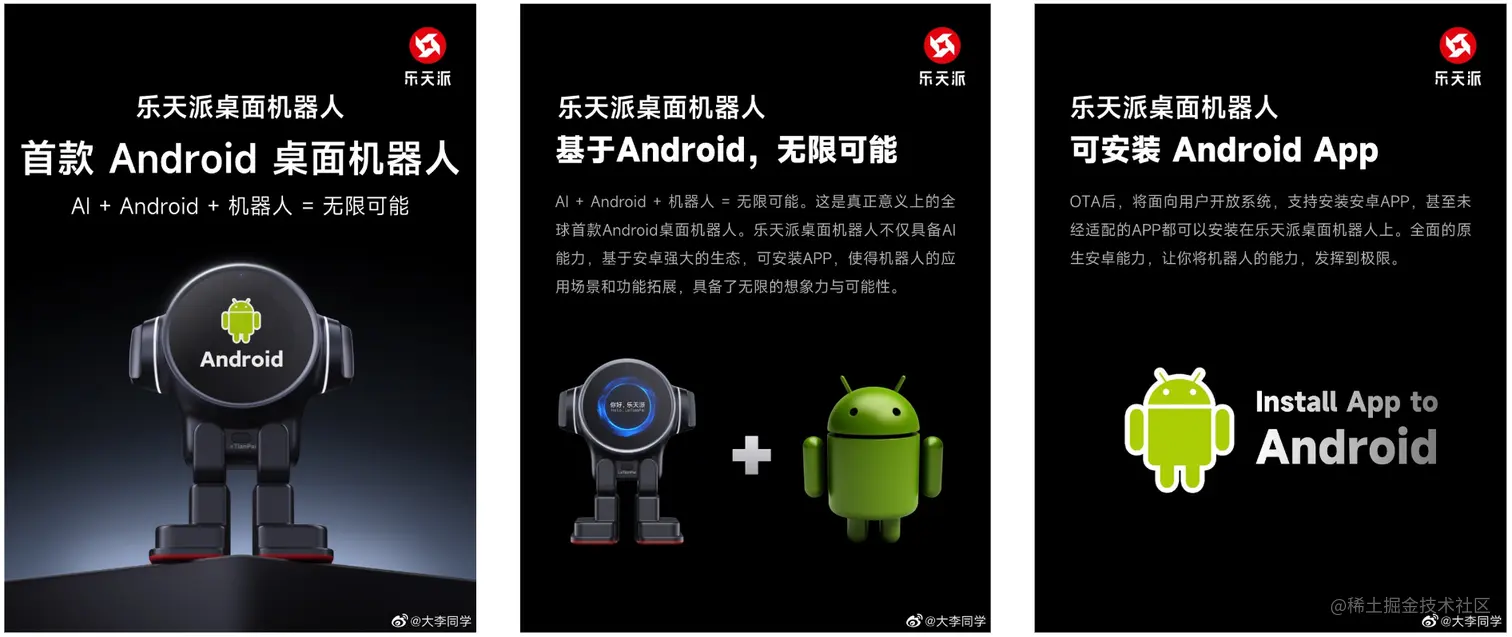 昨日,李明公布了乐天派桌面机器人的系统,号称是「全球首款 Android 桌面机器人」,支持安装 App,具有可玩性,将于 6 月 18 日前后发布。李明还表示 “AI + 安卓 + 机器人 = 无限想象力”。