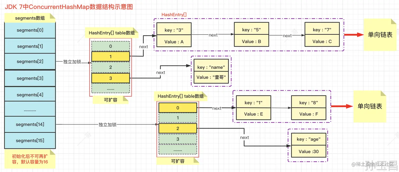 在JDK 7版本中,ConcurrentHashMap和HashMap的设计思路其实是差不多的,但为了支持并发操作,做了一定的改进。比如ConcurrentHashMap中的数据是一段一段存放的,我们把这些分段称之为Segment分段,在每个Segment分段中又有 数组+链表 的数据结构。默认情况下ConcurrentHashMap把主干分成了 16个Segment分段,并对每一段都单独加锁,我们把这种设计策略称之为 "分段锁", ****ConcurrentHashMap就是利用这种分段锁机制进行并发控制的。JDK 7中ConcurrentHashMap的基本数据结构如下图所示: