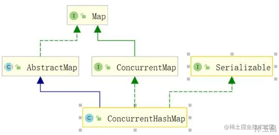 但两者所在的包是不同的,ConcurrentHashMap是在java.util.concurrent包中,HashMap是在java.util包中,我们可以参考下图: